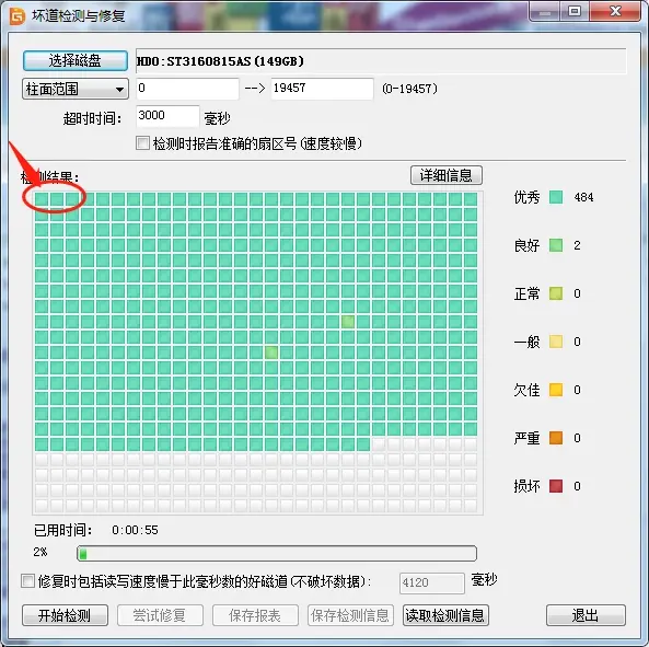 重要的一点是如果检测的第一二个磁道就是损坏的,那么你的硬盘损坏就是严重的,不管后面是否还有损坏,都要进行更换了,具体位置如下图:
