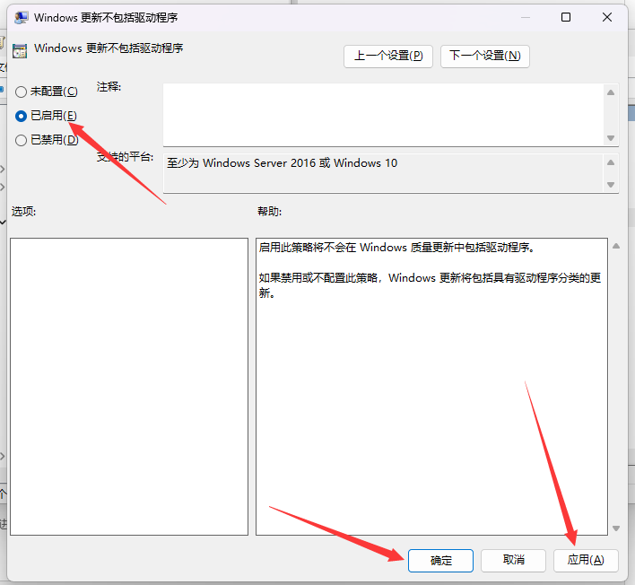 6、Windows 更新不包括驱动程序窗口,选择已启用并点击确定保存即可;