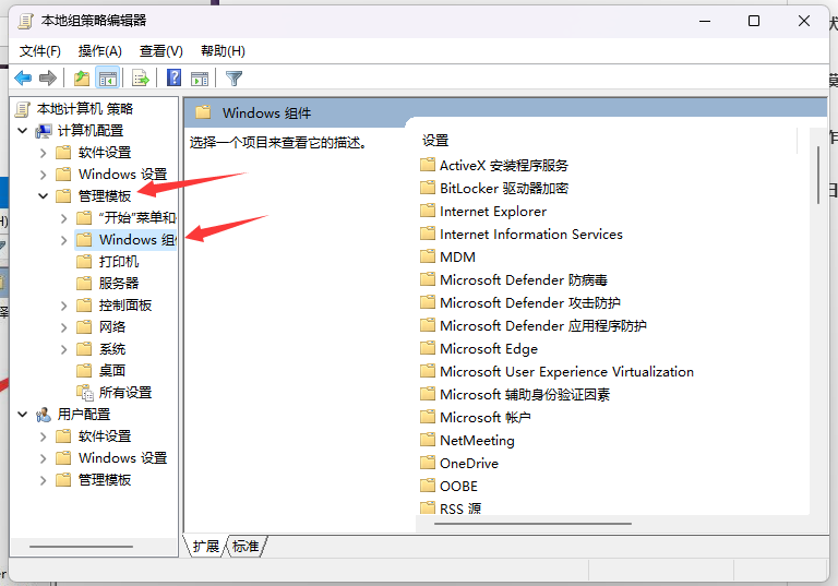 3、本地组策略编辑器窗口,依次展开到:计算机配置 - 管理模板 - Windows 组件;